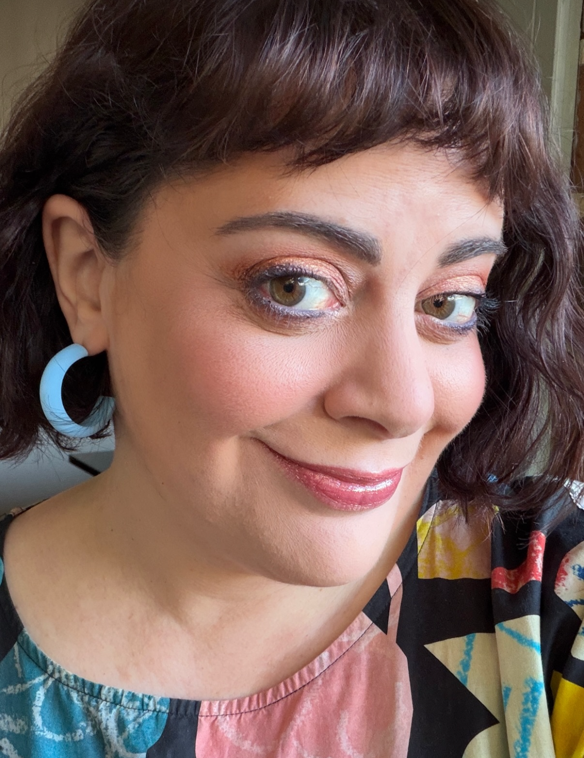A woman with dark hair, wearing a floral dress and large green hoop earrings, holding earring cards with colorful earrings, smiling at the camera against a plain beige background.
